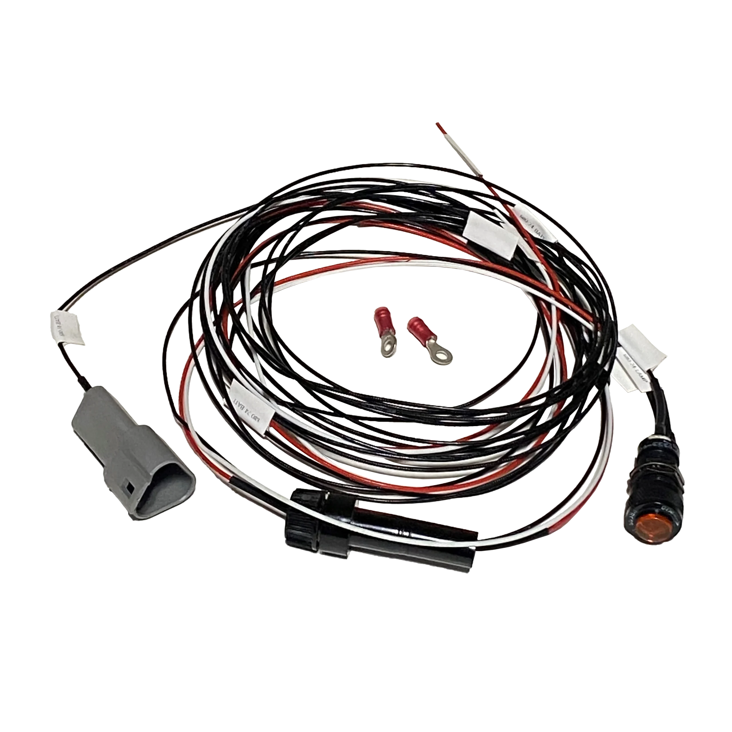 The positive wire (red wire) of the LED should be connected to the electrical bus (24volt positive), typically to a fuse/breaker downstream of the master switch. Connect the negative of the LED (black wire) to the fault monitor wire of the battery.