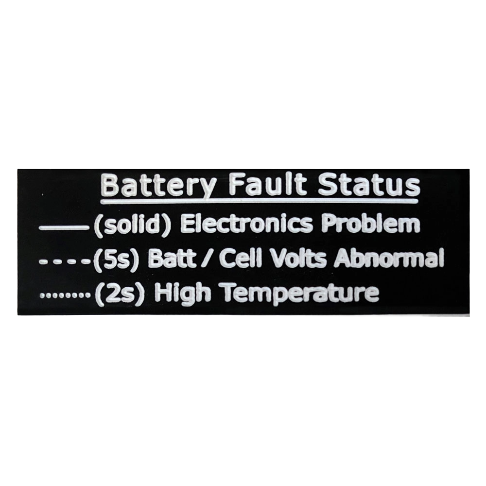 This professional looking placard is excellent to place near your LED fault light indicator on your panel for a quick reference to the 3 main types of battery fault conditions.