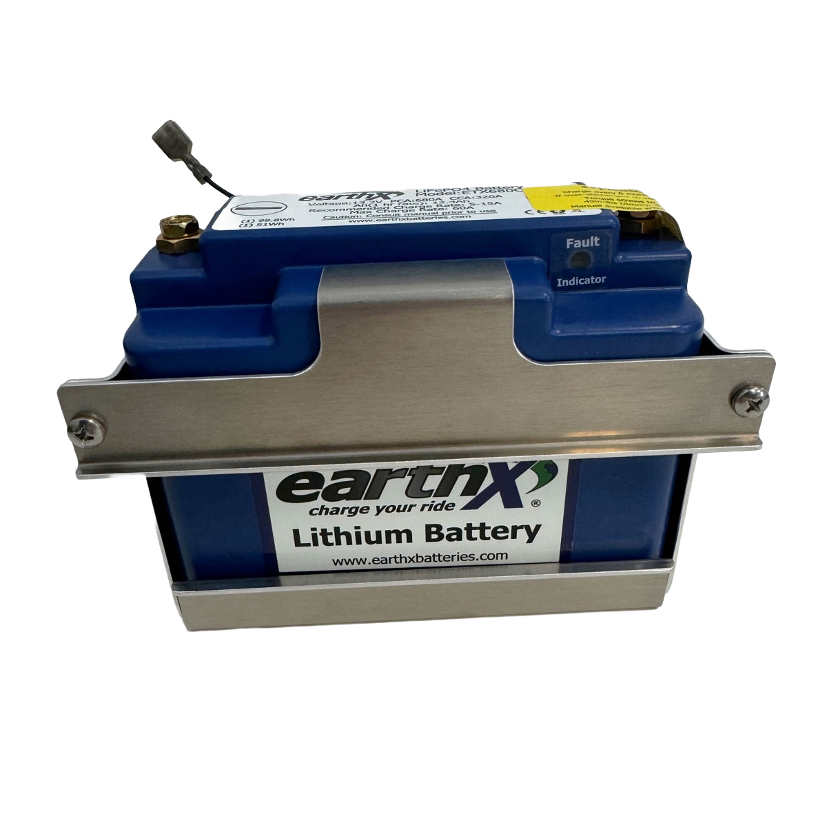 The light weight aluminum battery box is excellent to use with the ETX680C EarthX lithium battery. Has a bolt-down tab for easy removal of the battery from the front or top, and is acrobat rated.