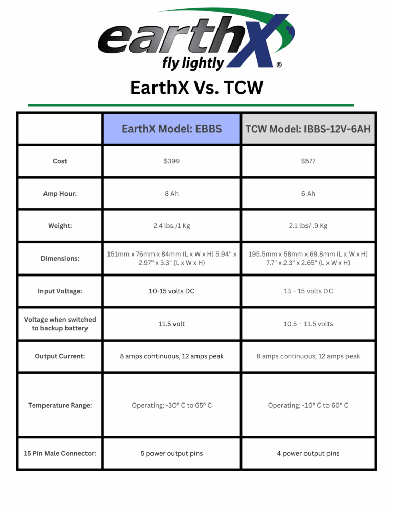 The EarthX Battery Backup System (EBBS) is engineered specifically for avionics and critical aircraft electrical systems. The EBBS can be used as a secondary power source for equipment with a second power source input or as an uninterruptible power source (aircraft power pass-thru with battery backup) for equipment with a single power input.